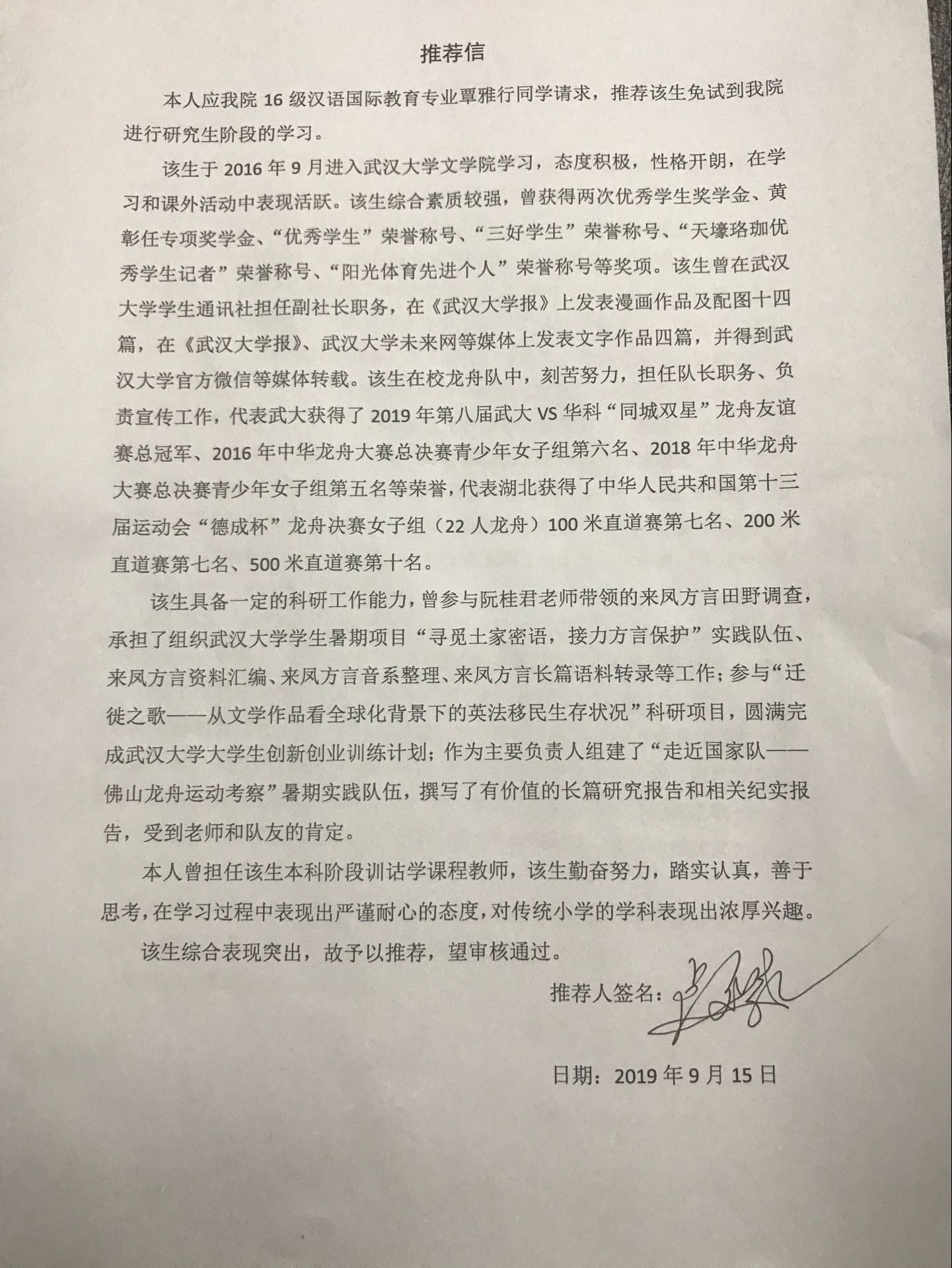 覃雅行必修课成绩在全班15名学生中位列第7,位居前50%,通过大学英语6级。该生在校龙舟队效力三年,代表湖北获得中华人民共和国第十三届运动会“德成杯”龙舟决赛女子组100米赛道第七名 |