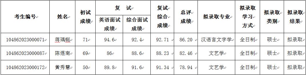 色小说 2023年港澳台硕士研究生复试工作已圆满结束。经色小说 研究生招生工作领导小组认真讨论并集体通过,拟录取蒋瑀蜓等三名考生。现将复试拟录取结果予以公示。