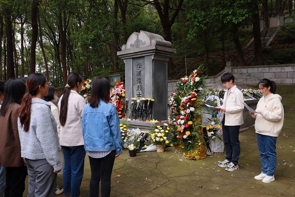 杨杰灵:日影昭然,影随人意,一切都显得那么静穆。在李汉俊烈士的墓碑前,我们送上鲜花,默哀致敬。在武大度过了近五年时光,我却第一次听说这位先烈的光辉事迹,以及他后辈们的感人故事。原来,英雄离我们的距离如此之近。古人言“一抔黄土掩风流”,但却掩不住炎黄子孙的感激之情,英雄的事迹早已载入历史,英勇的身影早已深入人心。愿烈士正气流千古,丹心照万年。