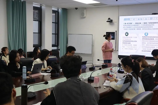 卢心语、左卉婧、李珍贞、李润菡、刘雨欣、向诗蕾、胡殊佳、董笑和成天骄同学分别发言,袁劲老师、汪超老师、葛刚岩老师就同学的发言分别进行了点评。在对发言人的论文进行充分交流后,老师与同学们在自由讨论环节也进行了一些互动与沟通。老师们指出,论文应集中而深入地针对某一点探讨问题,而不求面面俱到。