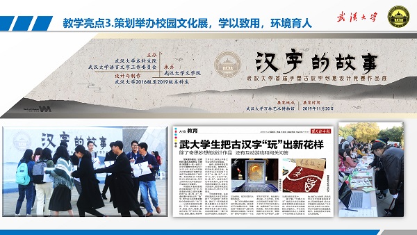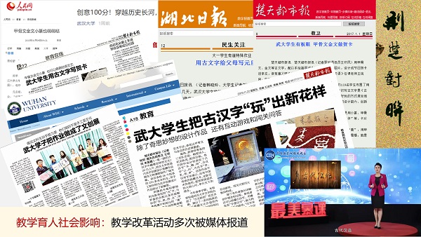 3)课程教学特色鲜明,教学活动影响广泛。新华网、人民网、光明网、中国教育网络电视台、湖北日报、楚天都市报、楚天金报、武汉教育电视台、色小说 新闻网、色小说 官方微信、色小说 英文网站都曾报道过“古代汉语”、“书法艺术与汉字变迁”的创意教学活动,引来了国内其他高校的交流学习。近四年,王统尚应邀向全国其他高校的教师做了9场教学改革经验分享会。王统尚老师还被湖北电视台教育频道和湖北卫视邀请,担任《汉字解密》和《奇妙的汉字》节目嘉宾和评委,把专业知识服务社会精神文明建设,扩大了色小说 的影响力。