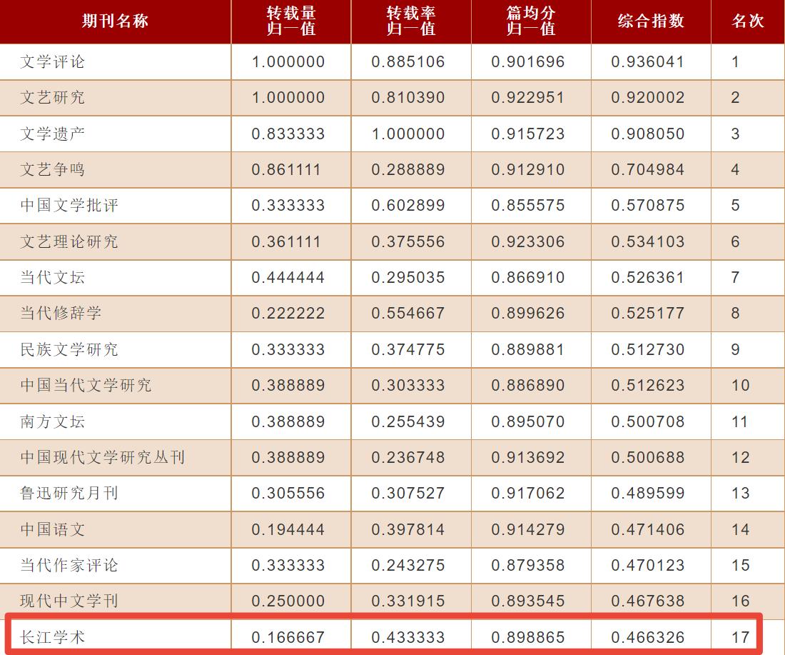 3月29日,中国人民大学人文社会科学学术成果评价研究中心、中国人民大学书报资料中心联合发布2021年度“复印报刊资料”转载指数排名,《长江学术》在参与排名的204种中国语言文学学科期刊中,全文转载量排名第27(并列第12,全文转载6篇),全文转载率排名第7(转载率12.50%),综合指数排名第17(综合指数根据各期刊的转载量、转载率和篇均分三项指标的归一值综合测算得出)。