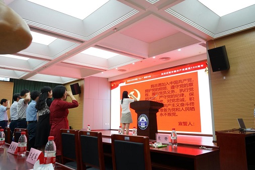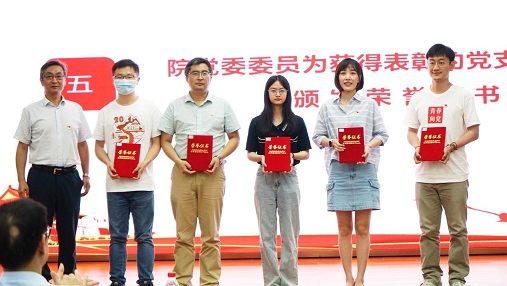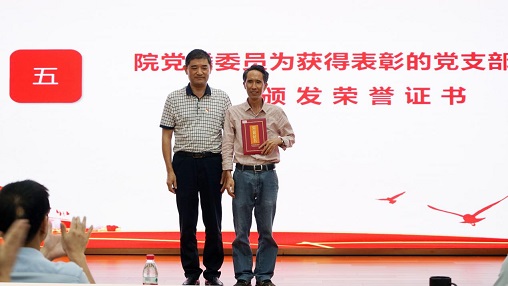 刘会胜副书记宣读《关于表彰优秀共产党员、优秀党务工作者和先进基层党组织的决定》,院党委委员分别向受到表彰的单位和个颁发荣誉证书,之后,由楚静副书记领誓,全体新党员进行入党宣誓、老党员重温入党誓词。