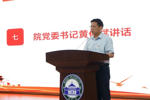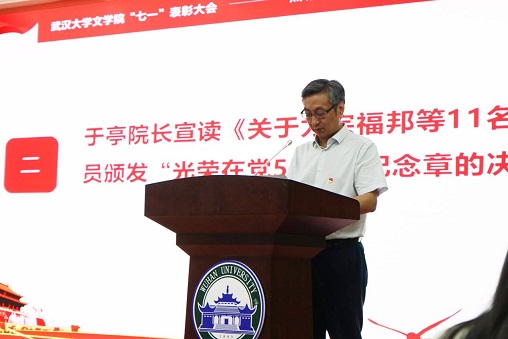 最后,黄佐斌书记讲话。他首先代表学院党委,向全院党员同志致以节日的问候!向获得“光荣在党50年”纪念章的各位老党员致以崇高的敬意!向受到表彰的先进个人和先进基层党组织表示热烈的祝贺!