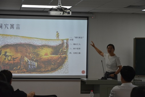 比赛正式开始,第一位上场的是艾士薇老师。艾老师通过讲述柏拉图《理想国》中的“洞穴寓言”的故事,深刻解读了“囚徒”“墙后之人”“两个世界”“光明之路”的寓意,引发听者对教育的反思。艾老师思维敏捷,侃侃而谈,为本次青教赛开了个好头儿。