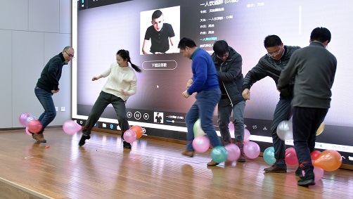 游戏环节也是笑声不断。“快乐传真”让在场观众分组上台用肢体语言表演传递成语,“对牛弹琴”“左顾右盼”“眉目传情”等一个个成语经老师们各自用肢体语言演绎,传递出了妙趣横生的喜剧效果,逗得台下观众捧腹大笑。踩气球比赛更是你追我赶,尖叫声、笑声、气球爆炸声响成一片,热闹非凡。