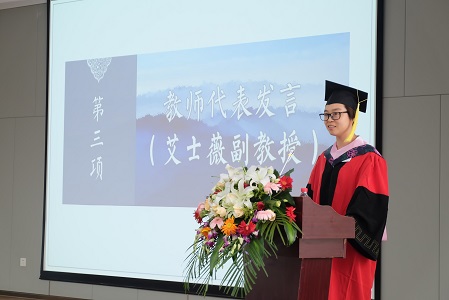 艾士薇副教授作为教师代表发言:“我和2014级孩子们一同进入色小说 ,一起走过了四年时光,相互见证彼此的成长。”艾士薇副教授用四个“保持内心的抵抗”与大家分享了自己的人生经验和感受:在这样一个媒体化和碎片化的时代,保持内心的抵抗;在面对既有知识和约定俗成时,保持内心的抵抗;在面对热门流行时,保持内心的抵抗;面对世俗生活,请保持内心的抵抗。