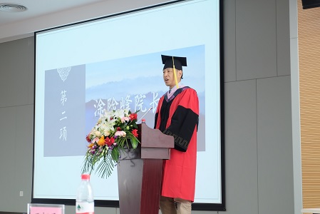 庄严肃穆的国歌演奏完毕,院长涂险峰教授致辞:“毕业,并不意味与母校缘分的终结。过去,母校在你们周遭、身外,当你们走出校门,在世界眼中,你们的一举一动、一言一行都是母校的精神风采、学脉传承的体现。”涂院长寄语毕业生们继续砥砺思想、提升智慧,心存批判质疑精神,不断用独立而冷峻的眼光,既审视世界又反思自我。最后,涂院长与大家分享了俄国作家陀思妥耶夫斯基的一句话“最要紧的是,我们首先要善良,其次要诚实,再次是以后永远不要相互遗忘”。