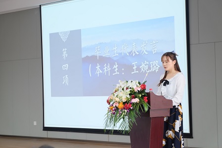 接下来是本科生代表王婉璐发言,她回首了四年的心路历程,感谢老师和同学一路的陪伴。“记得初夏在图书馆一角看书,岁月静好,日影深长;记得在教三走廊淡黄的灯光下念晚唐诗,廊外夜雨滂沱,廊上无风无雨;记得冬日暖阳中在桂操绕圈儿行,耳听松声,目送飞鸟。这些,只有在武大才能做到。”研究生代表丁旺说:“过去,我们训练的是系统完整的科研素养,培养起来的是文学情怀、武大情怀、人文情怀,坚守的是人性深处对真善美的追求,收获的是青春激荡的美好时光;如今,我们将带着这些宝贵财富起航,未来之路在我们脚下,无论走向何方、身处何方,都要成为合格的武大文院人。”