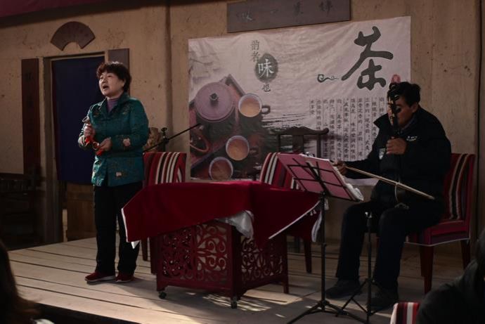 跟随讲解员的步伐,同学们穿梭在古城的街道中,好像集体穿越回了千年前的敦煌,真真切切的感受到了当时的敦煌风貌。行程不知不觉已到尾声,同学们走进一间茶馆,屋外寒风凛冽,屋内温暖惬意,捧着热茶,欣赏老板为同学们演唱的甘肃迷糊戏。独特的唱腔和曲调让同学们听得入迷,上午的行程也在悠扬的戏曲声中结束了。