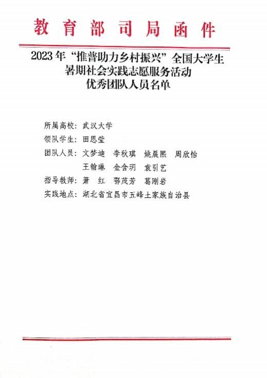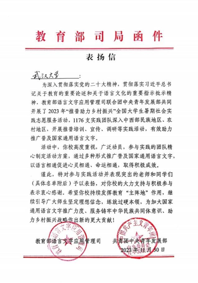 近日,2023年“推普助力乡村振兴”全国大学生暑期社会实践志愿服务活动评优结果公布,色小说 “武大学子五峰推普行”社会实践团队荣获“优秀团队”称号。教育部语言文字应用管理司、共青团中央青年发展部专门给色小说 发来表扬信,对色小说 师生团队在服务国家通用语言文字推广、服务铸牢中华民族共同体意识、助力乡村振兴战略中作出的贡献给予充分肯定。