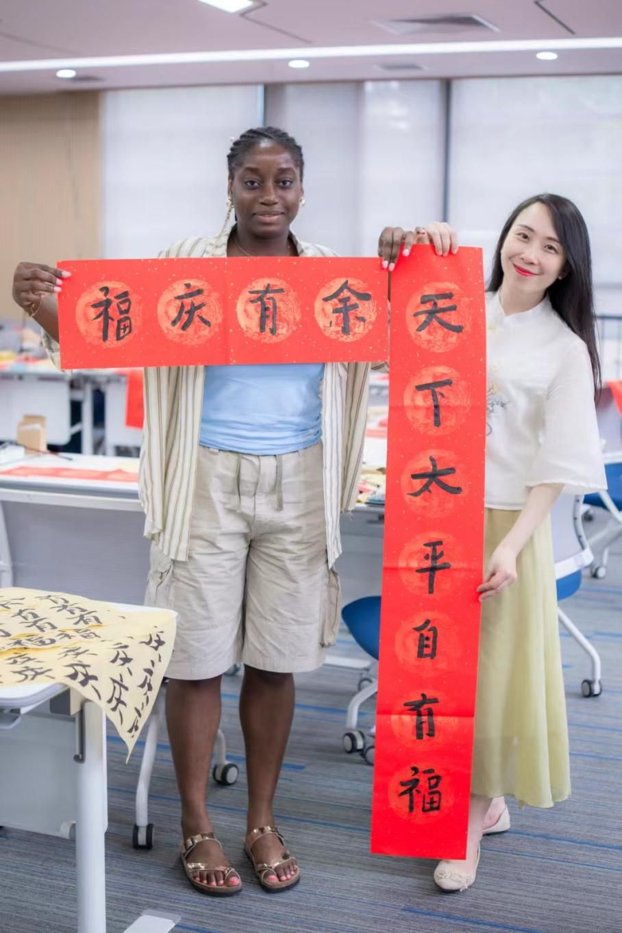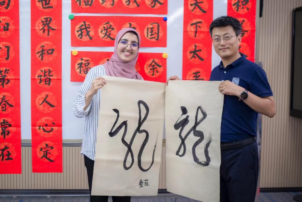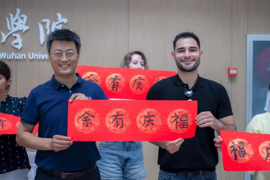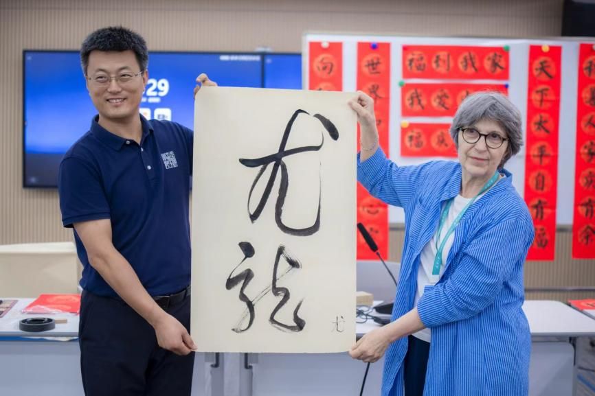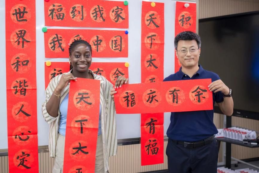 随后,活动进入高潮,王统尚老师带领学员们体验写对联。美好的祝福语跃然纸上,不仅展现了学员们对书法技艺的初步掌握,更寄托了他们对和谐世界的美好祝愿与深切向往。这一环节不仅是一次书法技艺的交流,更是心灵与文化的深刻对话,国际学子以笔墨为媒,传递出跨越国界的爱与和平之声。
