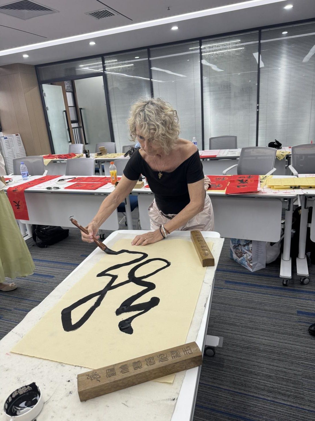 为了进一步提升学员们的艺术感受力,王老师还特别展示了草书中“龙”字的书写方式,其灵动飘逸、气势磅礴的笔触尽显中华书法艺术的灵动与奔放,让在场所有人为之惊叹。学员们跃跃欲试,虽然他们的笔触尚显稚嫩,但那份对中华文化的热爱与向往却跃然纸上,为这场书法实践活动增添了几分生动与活力。