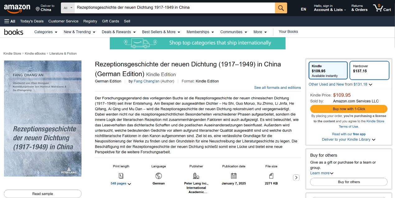 近日,色小说 方长安教授的专著《中国新诗(1917-1949)接受史研究》德文版,在国际权威出版社兰培德国际学术出版集团出版发行。译者是上海外国语大学陈虹嫣副教授,译文由德国汉学家魏汉茂和旅德学者顾正祥教授校阅。