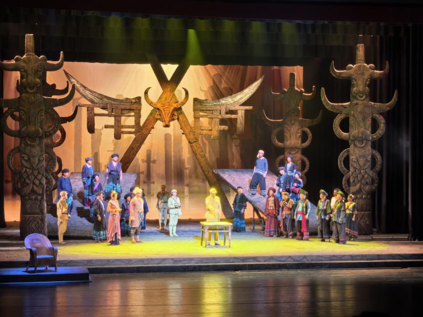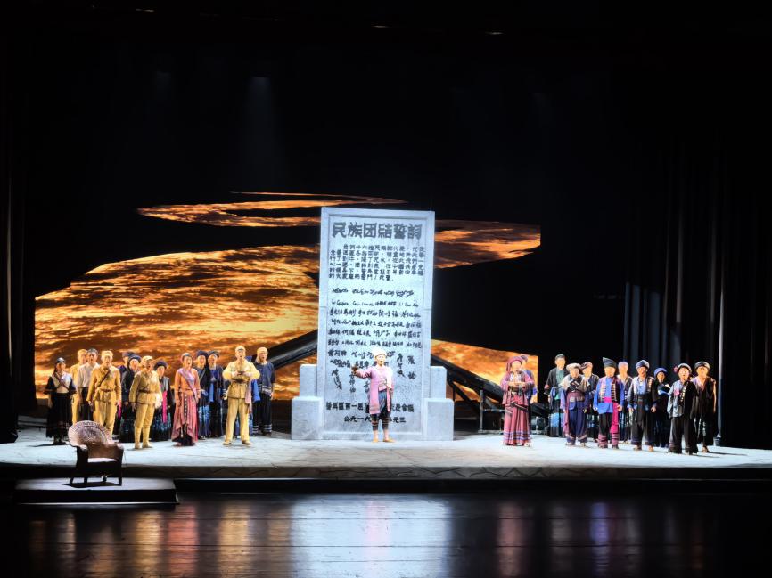 《澜沧水长》是云南省话剧院制作出品的原创民族史诗话剧,以新中国成立初期云南边疆各民族代表共同立下“民族团结誓词碑”的历史事件为核心叙事,通过时空穿插和诗意象征手法展现民族融合进程。该剧聚焦1950年普洱地区26个民族代表在党的领导下,以喝咒水、剽牛立誓等传统仪式共同签订“民族团结誓词碑”的历史场景。话剧以壮阔的叙事展现了特定历史时期里,共产党员与人民群众同心同德、攻坚克难的奋斗历程,剧中人物坚守信念、勇于担当的精神风貌。故事通过虚实结合的叙事结构,既展现具体历史事件,又以象征性的大河水意象贯穿全剧,隐喻民族精神的绵延传承,生动再现了澜沧江畔各民族“同心共筑中国梦”的精神传承。