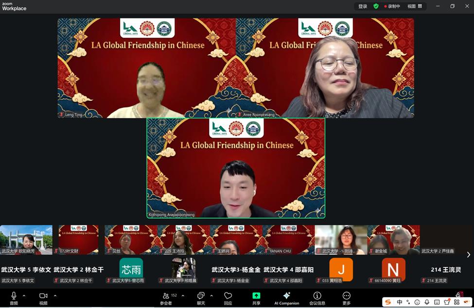 中国学生的展示同样精彩纷呈。大家围绕武汉城市文化、中国传统乐器琵琶、特色饮食糊涂粥、大学生养生八段锦四大主题展开分享,从历史底蕴、艺术魅力、饮食特色到传统养生智慧,全方位、多角度展现中国文化的独特魅力。其中,琵琶现场演奏、八段锦互动教学的环节,更是给泰方师生留下深刻印象,收获线上听众的频频点赞。