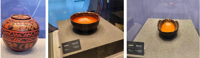 文字古朴而厚重,艺术神秘而肃穆。从简牍厅出来,便到了秦汉漆器展。这里集中展示战国至汉代彩绘漆器,多为墓葬出土,色彩以黑红二色为主,保存完好。