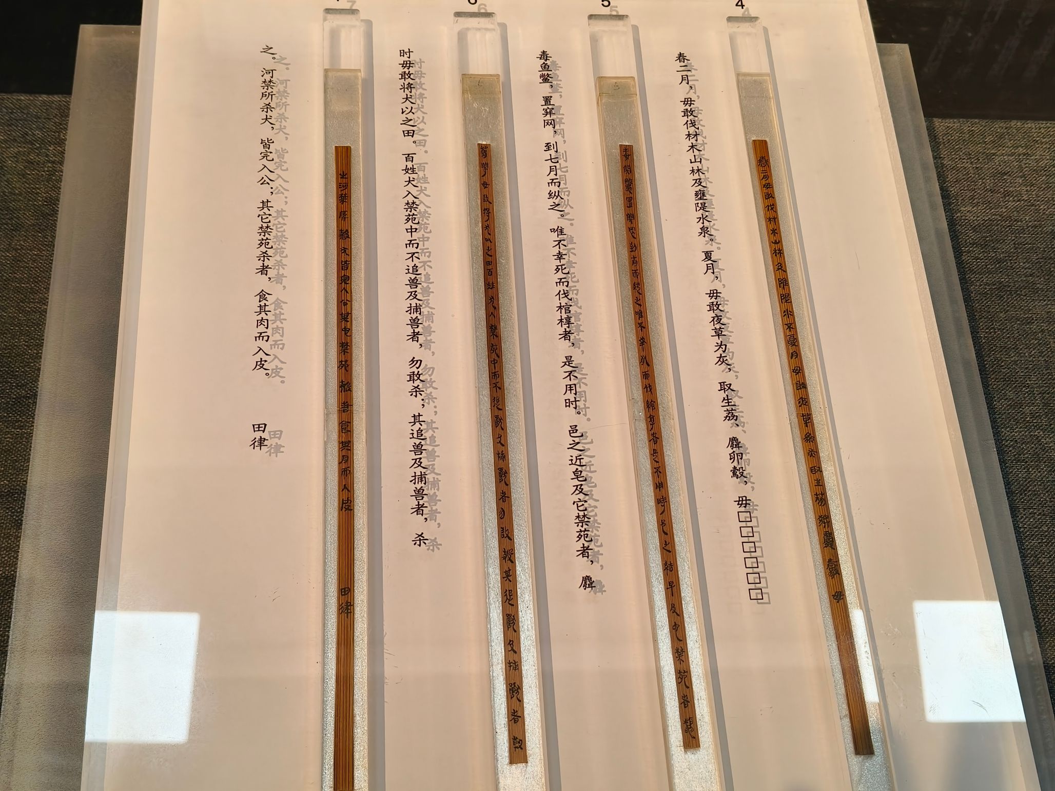 第一个展厅是云梦秦汉简牍展。一枚枚简牍上的秦隶工整清晰,打破了课本中秦律“严刑厉法”的单一印象,让我们看见两千多年前的社会百态:是春二月不伐木,唯伐棺椁者是不用时的网开一面;是“女子一人当男子一人”的最早男女同工同酬;是路见不平如果不拔刀相助反而会受罚的强制“见义勇为”……字里行间,秦人的生活秩序与处世准则,被我们一点点拼凑、读懂。