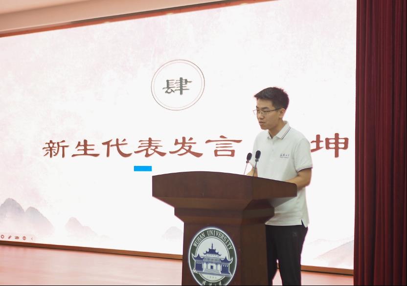接下来,2024级中国古典文献学硕士研究生宋坤同学作为新生代表在典礼上发言。作为首届古文字强基班的优秀同学,他回顾了自己本科期间的读书和科研项目经历,向同学们提出武汉大学有充分而深厚的土壤供同学们探索,同学们可以不断探索自己的兴趣。关于如何探索自己的阅读兴趣,他参考了严耕望先生《治史三书》中的方法,即于图书馆中浏览,在何处停留最久就是个人兴趣所在。他最后祝愿同学们成为一名合格的研究生,也成为独当一面的成年人,不辜负家长和师长的期望,在未来继续书写青春故事。