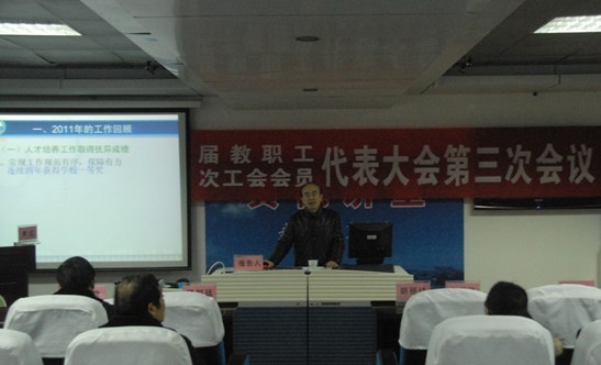 工会代主席刘会胜作了工会工作报告。2011年学院工会以“凝聚职工,增强活力”为工作原则,加强教代会、工会的组织建设,促进了二级教代会的规范化、民主化进程,完成大量事务工作,实现二级工会的维权职能,开展丰富的文体活动,凝聚人心,振奋精神。2012年学院工会将力争重建职工之家,加强工会建设、开展丰富多彩的文体活动,为学院的进一步发展和教职工更加美好的生活发挥应有的作用。