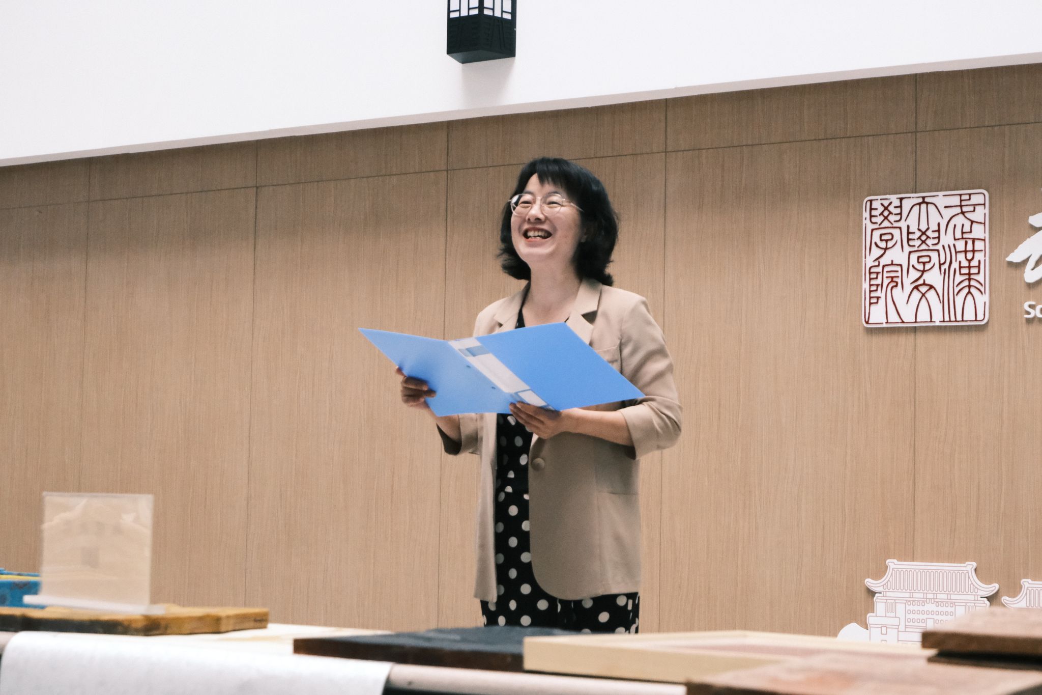 武汉大学文学院党委副书记王若飞在致辞中高度肯定了非遗传承与传播的价值,表达了对非遗传人的敬意。她指出,举办雕版印刷体验活动,是对2022年中共中央办公厅、国务院办公厅印发《关于推进新时代古籍工作的意见》的进一步落实,也是对习近平总书记加强文化遗产保护传承重要论述的积极响应。她鼓励同学们珍惜机会,在老师们的指导下认真学习,潜心体验,有所收获。