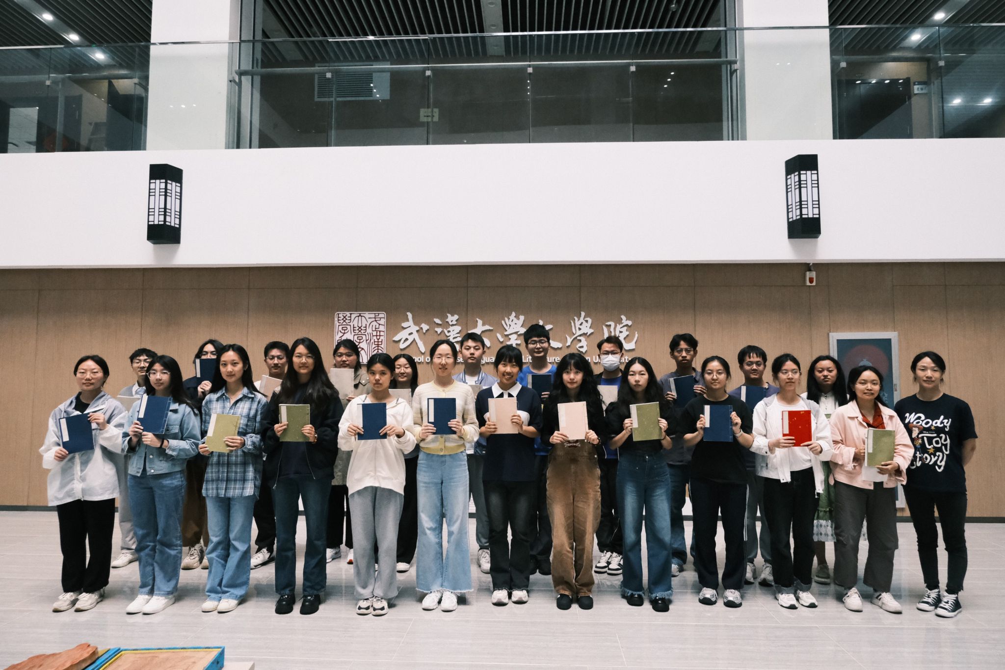 王鑫鑫老师指导同学们亲手装订了一册融合了武汉大学文学院院牌、院章、院训等元素的专属线装书。王老师耐心讲解,循循善诱,纷繁复杂的装订流程,被细致地拆解为分页、折页、墩齐、齐栏、上书衣、裁切、穿线等步骤,带着大家讲一步、做一步,确保每一位同学都有参与感与成就感。