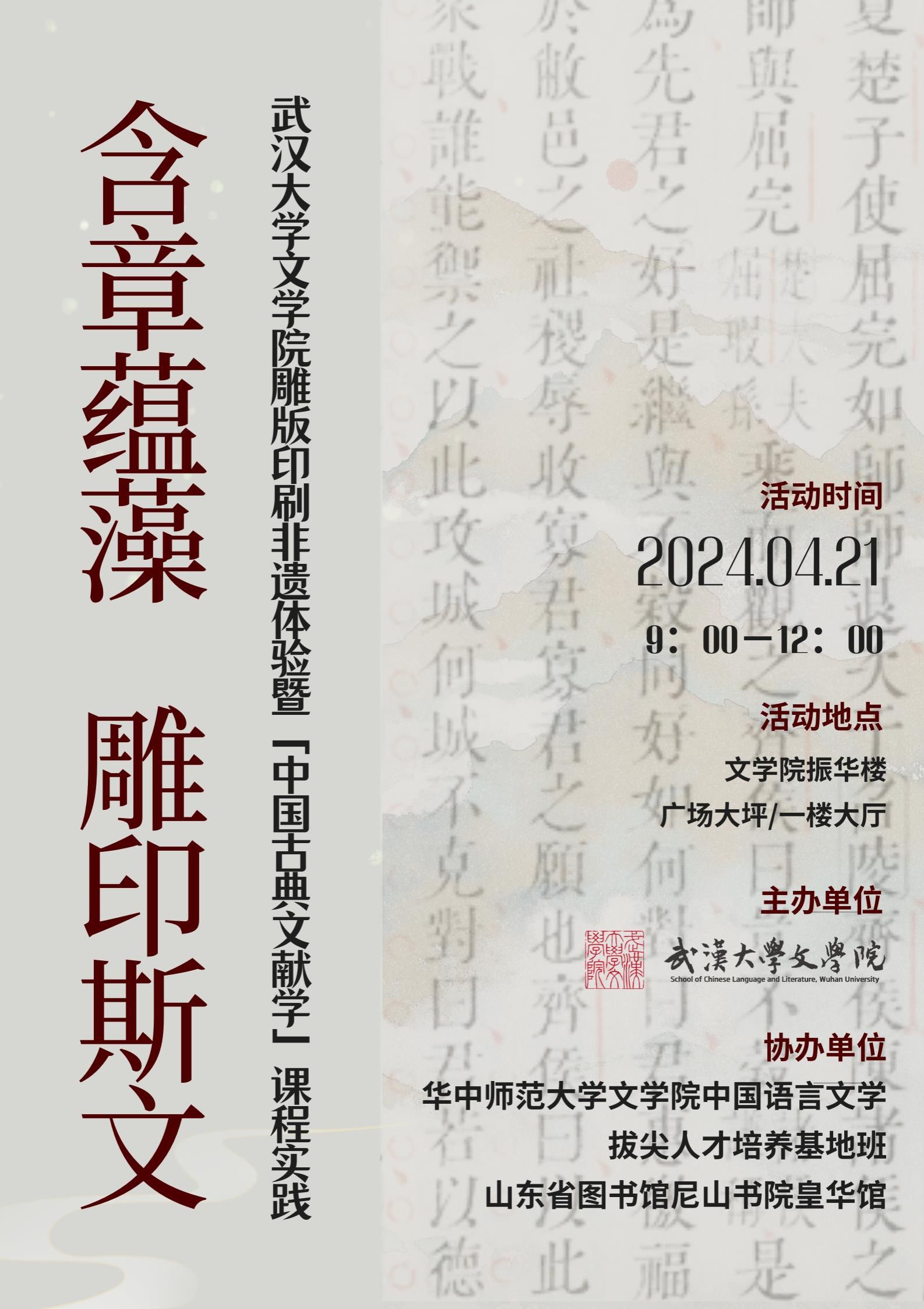 4月21日,武汉大学文学院学生会生涯发展部与学习部共同开展了面向全校的“含章蕴藻,雕印斯文”非遗文化体验活动。本次活动由武汉大学文学院与华中师范大学文学院中国语言文学拔尖人才培养基地班联合主办,受到山东省图书馆尼山书院皇华馆的大力支持。活动以雕版印刷为中心,还包括雕刻书版、活字印刷、套版印刷、饾版与拱花、古书装帧等多个项目的展览与体验。雕版印刷不仅是我国古代非物质文化遗产,而且是“中国古典文献学”课程的重要内容,本次活动将非遗体验与课程实践相结合,寓学于乐,在朱墨刷印与穿针引线间,进一步提升了同学们继承和弘扬中华民族优秀传统文化的热情,加深了对课堂所学知识的理解与运用。